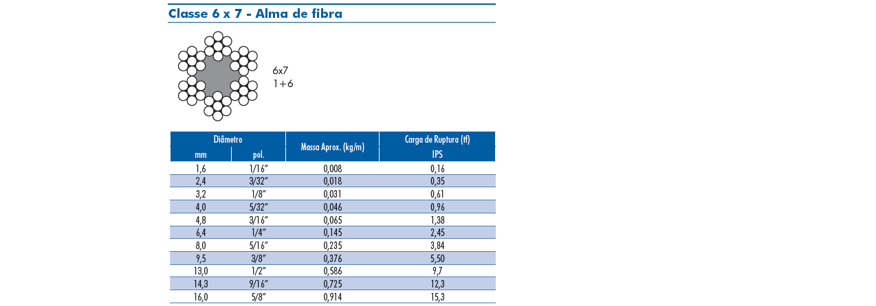 Código (SKU) 2 Marca Frati Especificações Técnicas Os cabos de aço 6x7 possuem excelente resistência a abrasão, pressão e baixa flexibilidade, sendo a sua aplicação limitada. Peso (kg) 3.6000