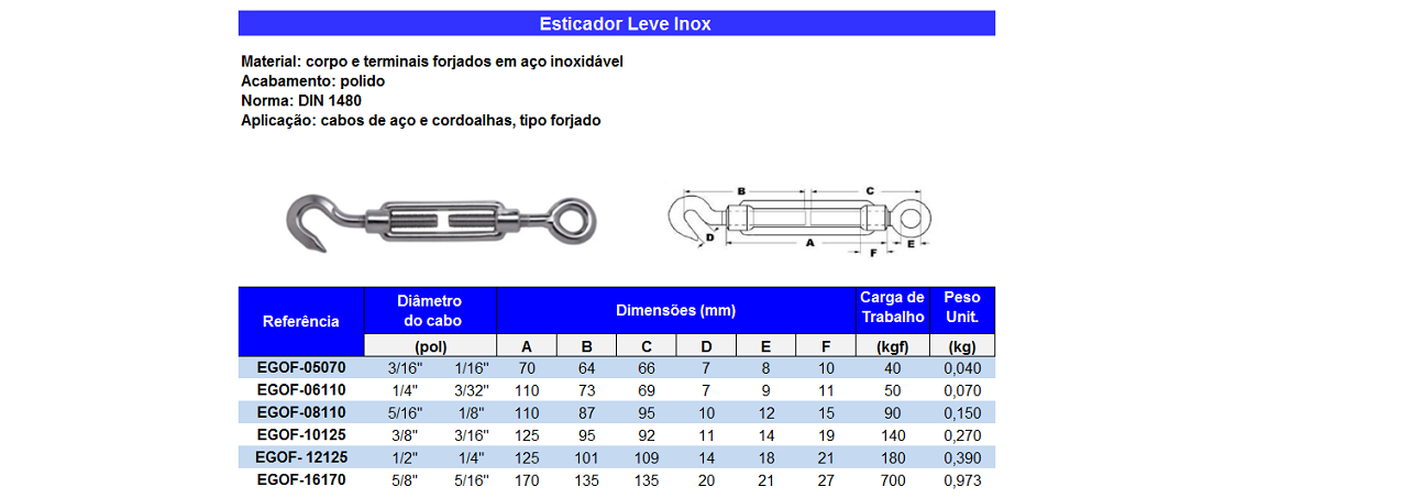 O Esticador Inox Gancho x Olhal é um acessório utilizado em cabos de aço e cordoalhas nos processos de elevação e Fixação de Cargas.
